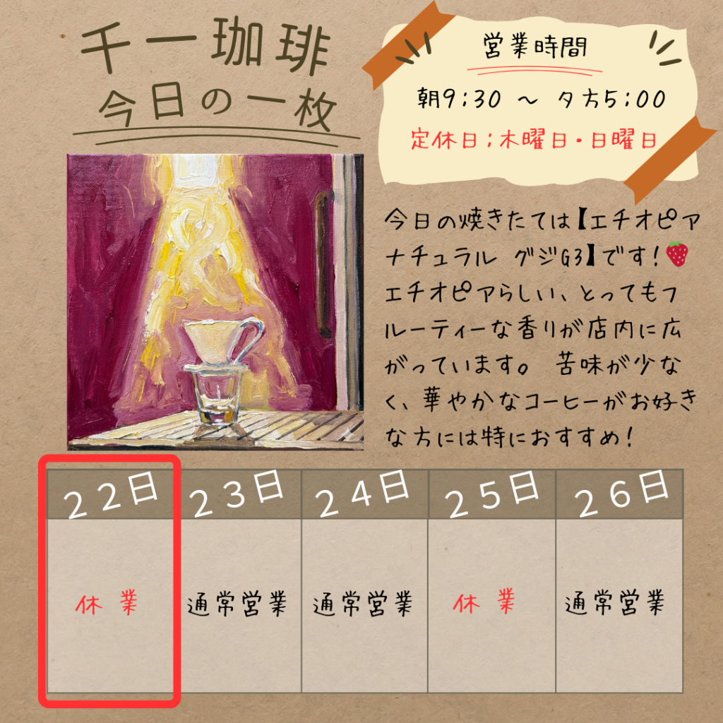 2026年1月22日 本日1月22日(木)は、定休日を頂戴しております おはようございます。 本日1月22日(木)は、定休日を頂戴しております。 ご来店を予定されていたお客様には大変申し訳ございませんが、何卒ご了承くださいませ。 明日1月23日(金)は、通常通り朝9時半より営業いたします。 週末に向けて、また美味しいコーヒーをご用意して皆様をお待ちしております。 どうぞ温かくして、良い木曜日をお過ごしください。 岡部千信 千一珈琲の店主