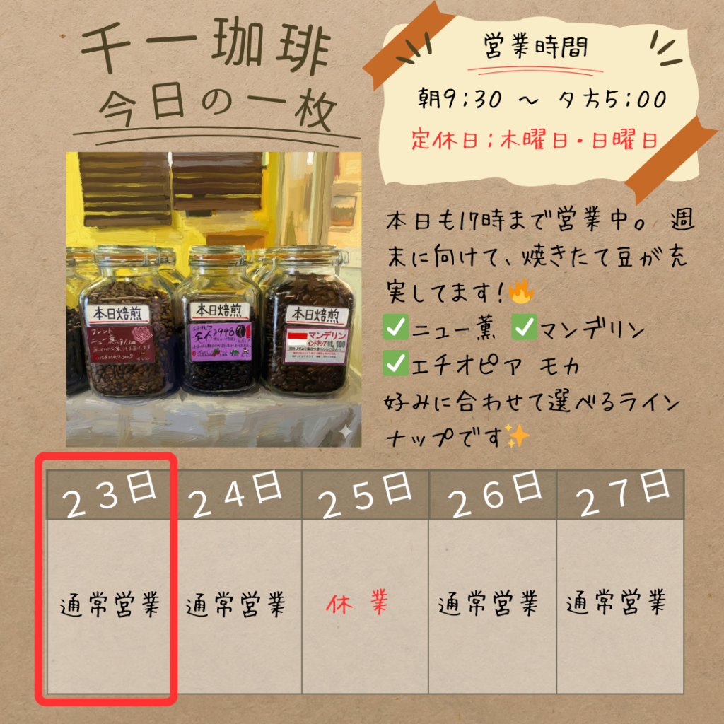 週末のおうちカフェ用に、焼きたての香り高いコーヒーはいかがでしょうか? 皆様のご来店をお待ちしております。