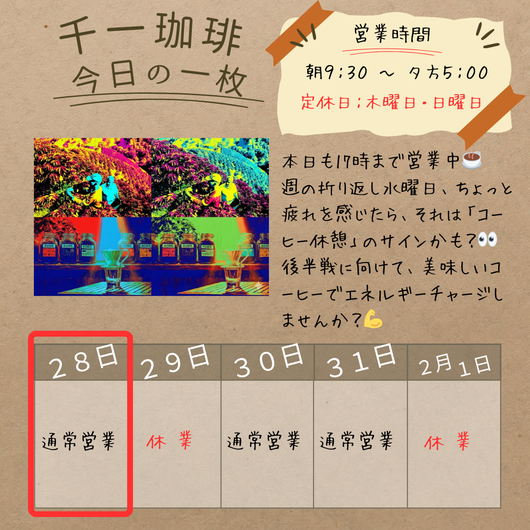 2026年1月28日 本日も夕方5時まで元気に営業しております。 こんにちは! 週の真ん中、水曜日。 本日も夕方5時まで元気に営業しております。 一週間の折り返し地点、皆様いかがお過ごしでしょうか? 「あと半分頑張ろう!」と気合を入れたい時も、 「ちょっと一休みしたいな」という時も。 当店の自家焙煎コーヒーが、皆様の午後の活力になれば幸いです。 店内暖かくして、香り高い一杯をご用意してお待ちしております。 お仕事帰りやお買い物のついでに、ぜひお立ち寄りください☕️ 岡部千信 千一珈琲の店主