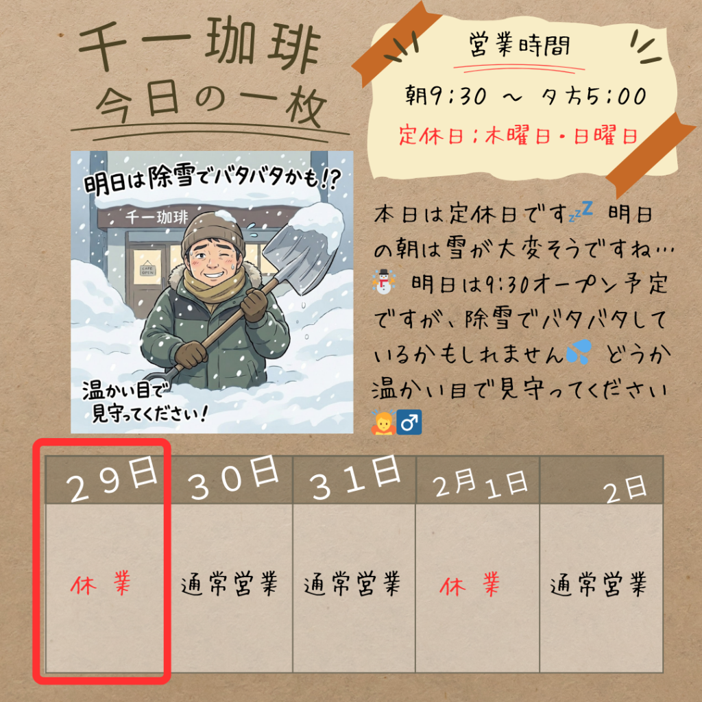 ただ、もし雪の量がすごかった場合、開店直後はまだ私がスコップを持って必死に雪と格闘しているかもしれません…💦 店内が少しバタバタしていたり、私の息が上がっていたりするかもしれませんが(笑)、どうか温かい目で見守っていただければ幸いです🙇♂️