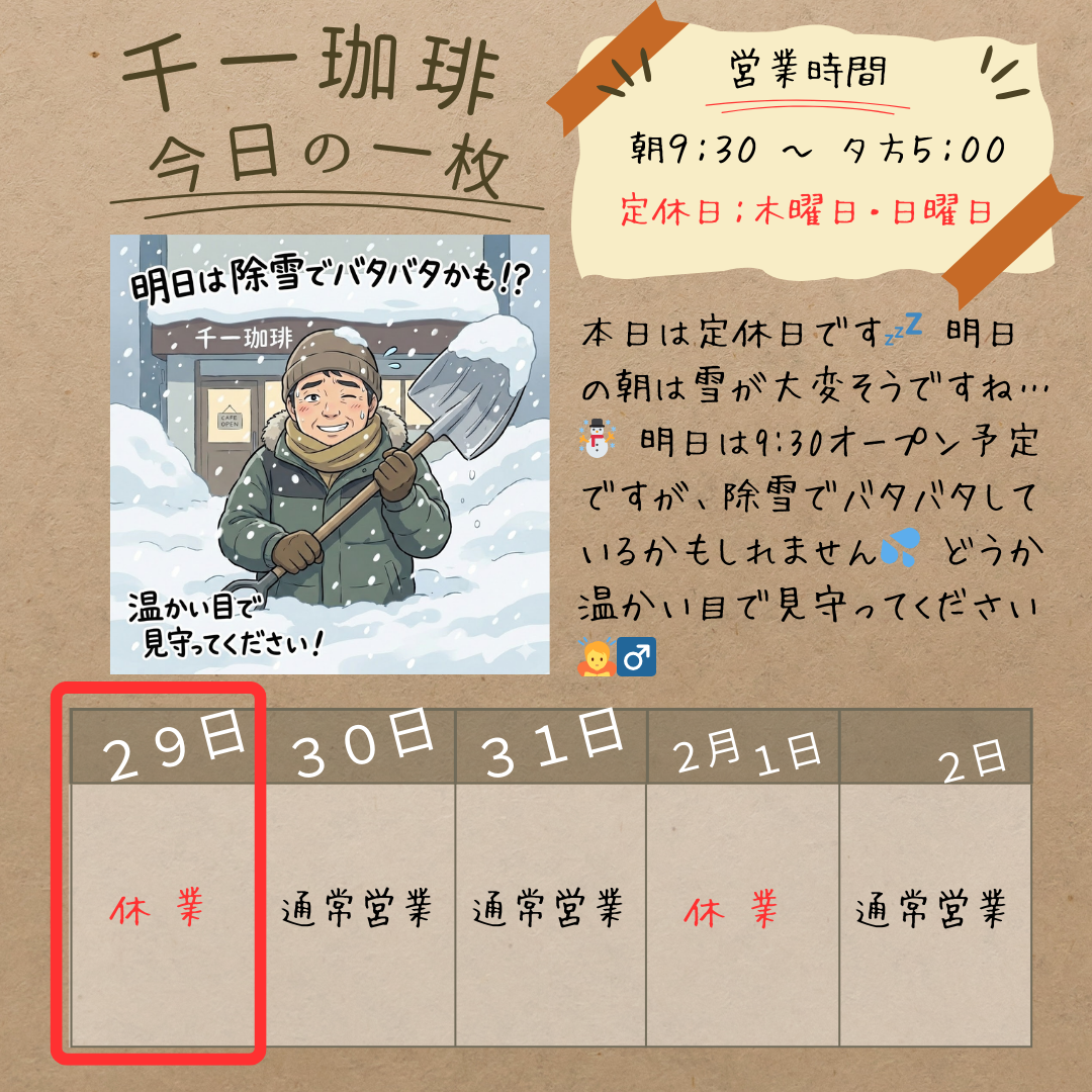 おはようございます。 本日1月29日(木)は、定休日を頂戴しております。