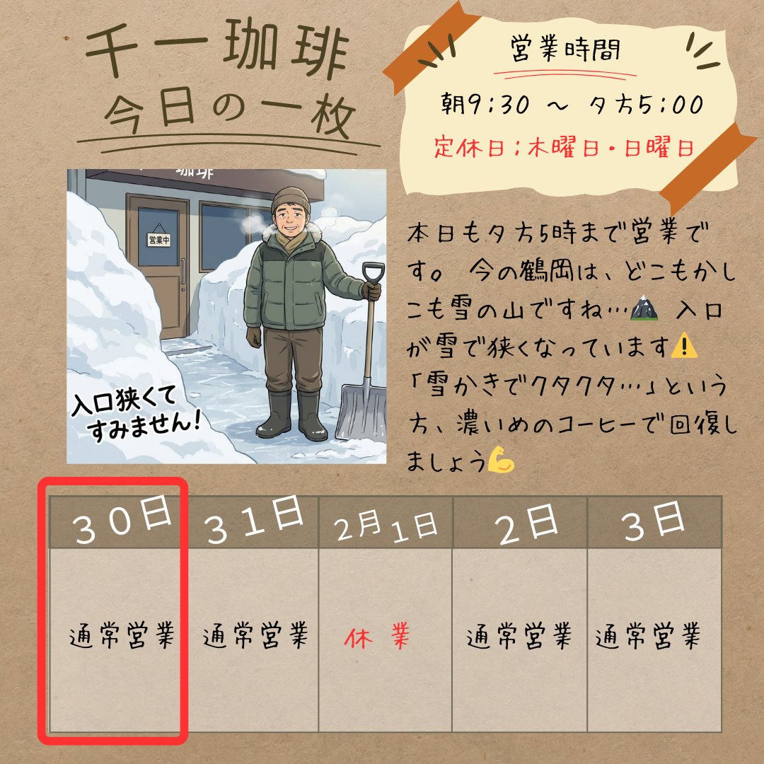 2026年1月30日 本日も夕方5時まで営業しております。やっとお店の周りの除雪作業が終わりました! ☃️💦 こんにちは! 金曜日、本日も夕方5時まで営業しております。 先ほど、やっとお店の周りの除雪作業が終わりました! ☃️💦 (昨日の予報通り、朝から格闘しておりました…笑) なんとか駐車スペースと通路は確保しましたが、除雪した雪の壁で入口付近などが少し狭くなっております。 ご来店の際は、お車の方も徒歩の方も、接触や足元に十分お気をつけてお通りください。 雪かき後の身体に染み渡る、温かいコーヒーをご用意してお待ちしております。 ひと仕事終えた方も、これからの方も、ぜひ一息つきにいらしてください。 岡部千信 千一珈琲の店主