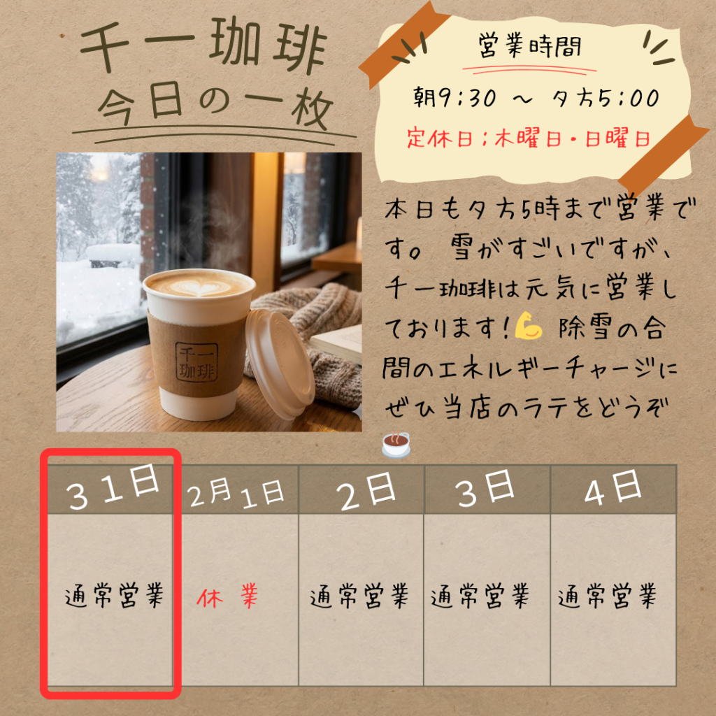 2026年1月31日 こんにちは!💪本日も夕方5時まで営業です✨ こんにちは!本日も夕方5時まで営業です。 雪がすごいですが、千一珈琲は元気に営業しております!💪 寒い日は、熱々のカフェラテで温まるのが一番ですね。 当店の「イタリアンブレンド」で作るラテは、濃厚で満足感たっぷりです✨ 除雪の合間のエネルギーチャージにぜひ! 岡部千信 千一珈琲の店主