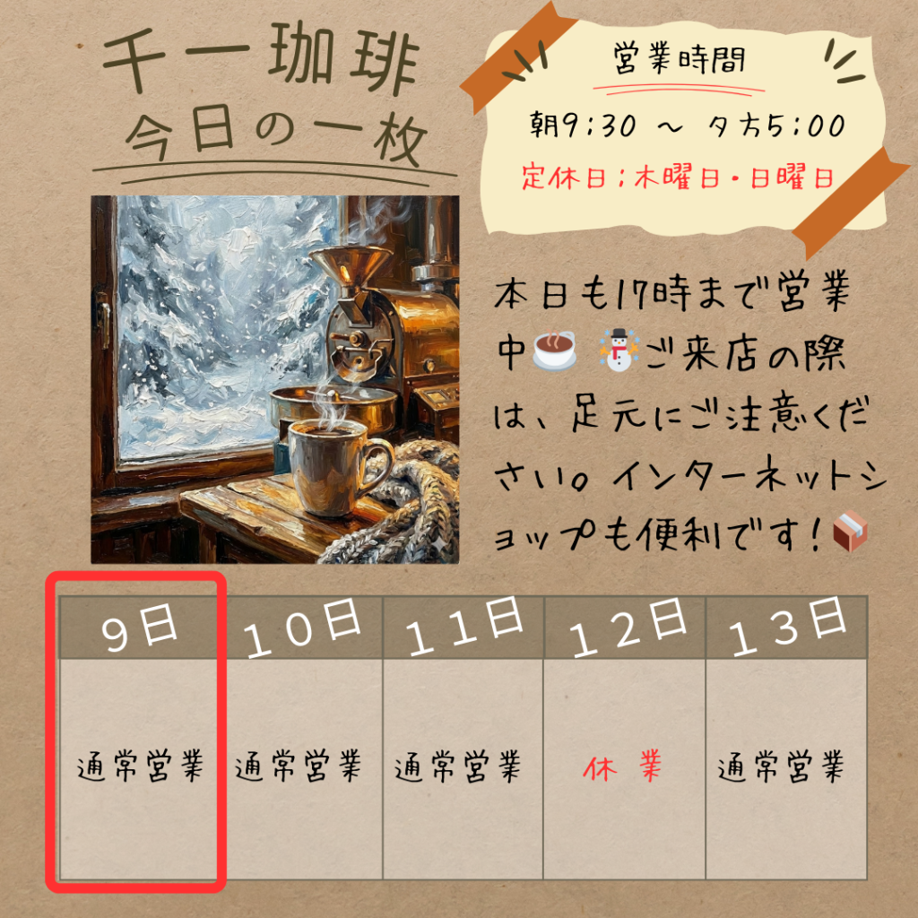 2026年2月9日 本日も17時まで営業中☕️ 外は少し吹雪いております☃️💨 2/9(月)本日も17時まで営業中☕️ 外は少し吹雪いております☃️💨 ご来店の際は、運転や足元に十分ご注意ください⚠️ 外出が難しい日は、インターネットショップも便利です!📦 ご自宅へ焼きたて豆をお届けします🚛 無理せず、安全第一でお過ごしくださいね。 岡部千信 千一珈琲の店主
