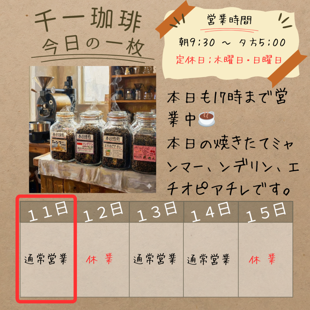 まずは本日ラストのミャンマー、そして定番のマンデリンとエチオピア。 焼きたての香りと共に、皆様のご来店をお待ちしております!