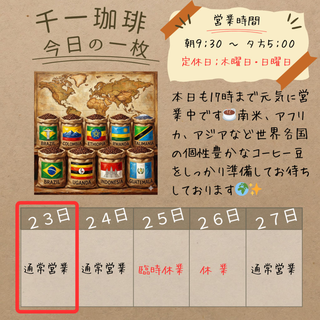 2026年2月23日 2/23(月・祝) 本日も17時まで元気に営業中です☕️ 2/23(月・祝) 本日も17時まで元気に営業中です☕️ 連休最終日、いかがお過ごしでしょうか?😌 当店では本日も、南米、アフリカ、アジアなど世界各国の個性豊かなコーヒー豆をしっかり準備してお待ちしております🌍✨ 明日からの活力になるような、あなたにぴったりのお豆を探しにきませんか?🚗 皆様のご来店をお待ちしております! 岡部千信 千一珈琲の店主