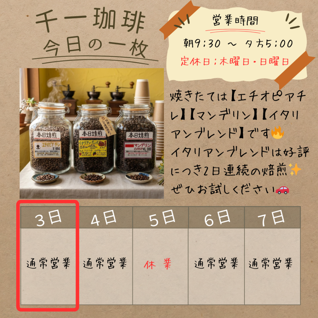2026年3月3日 本日の焼きたては【エチオピアチレ】【マンデリン】【イタリアンブレンド】です🔥 本日も17時まで営業中☕️ 本日の焼きたては【エチオピアチレ】【マンデリン】【イタリアンブレンド】です🔥 中でもイタリアンブレンドは好評につき2日連続の焙煎!✨ お手頃価格と、安定したコクと香りが人気の秘密です。ホットでもアイスでも頼りになる万能選手、ぜひお試しください🚗 #千一珈琲 #鶴岡 #自家焙煎 #イタリアンブレンド 岡部千信 千一珈琲の店主