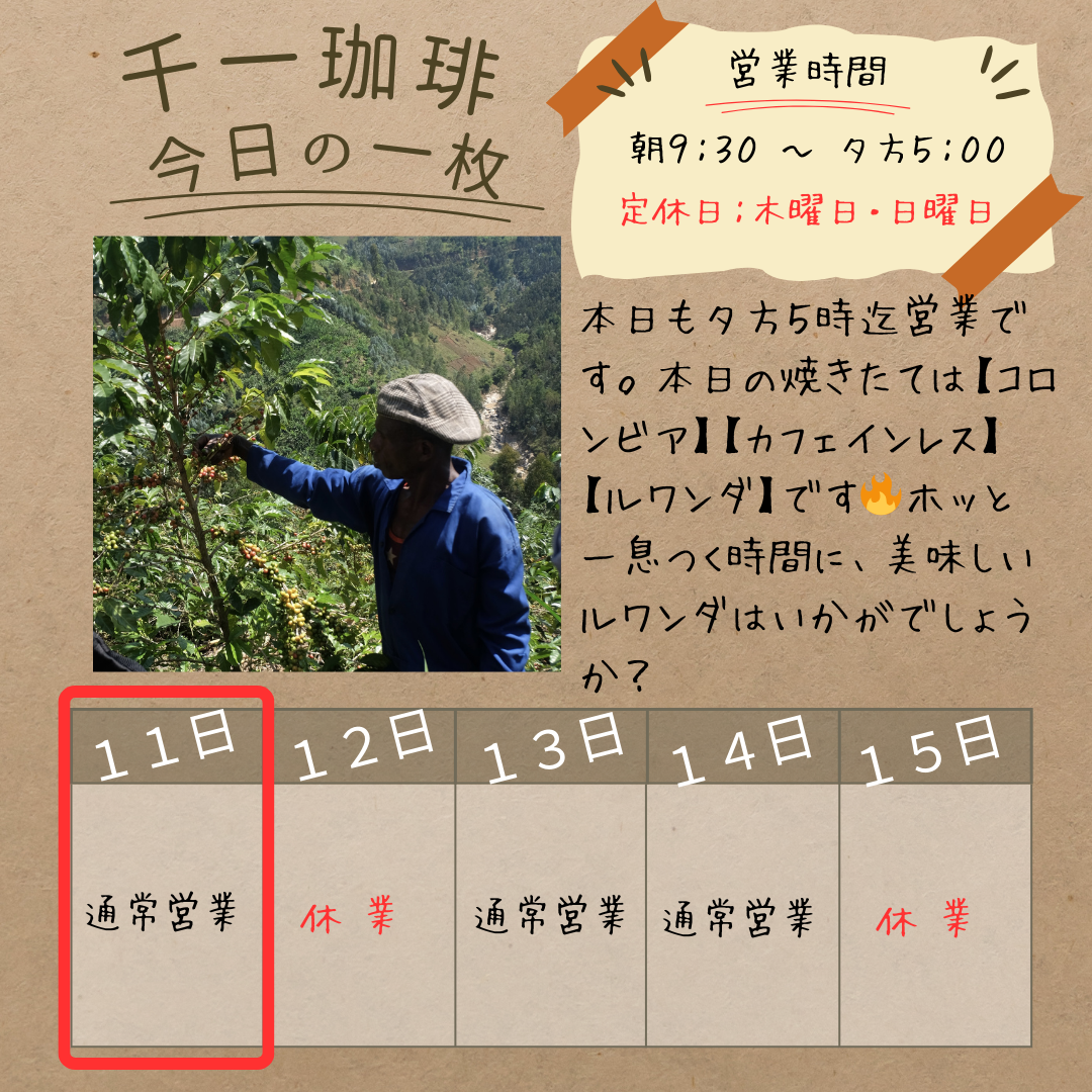 2026年3月11日 本日の焼きたては【コロンビア】【カフェインレス】【ルワンダ】です🔥 おはようございます、千一珈琲です☕️ 本日も17時まで元気に営業中! 本日の焼きたては【コロンビア】【カフェインレス】【ルワンダ】です🔥 今日のイチオシ「ルワンダ」は水洗式(ウォッシュド)!とてもクリーンな味わいの中にしっかりとしたコクがあり、どなた様にもおすすめできるバランスの良いコーヒーです✨ぜひお試しください🚗💨 #千一珈琲 #鶴岡 #自家焙煎 #ルワンダコーヒー #水洗式 岡部千信 千一珈琲の店主