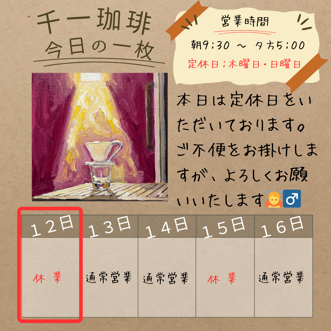 2026年3月12日 【定休日のお知らせ】 本日は定休日をいただいております。 【定休日のお知らせ】 おはようございます、千一珈琲です☕️ 誠に勝手ながら、本日は定休日をいただいております。ご不便をお掛けしますが、よろしくお願いいたします🙇♂️ お休み明けに、また美味しい焼きたてコーヒーをご用意して皆様をお待ちしております🔥 皆様も良い一日をお過ごしください! #千一珈琲 #鶴岡 #定休日のお知らせ #自家焙煎 岡部千信 千一珈琲の店主