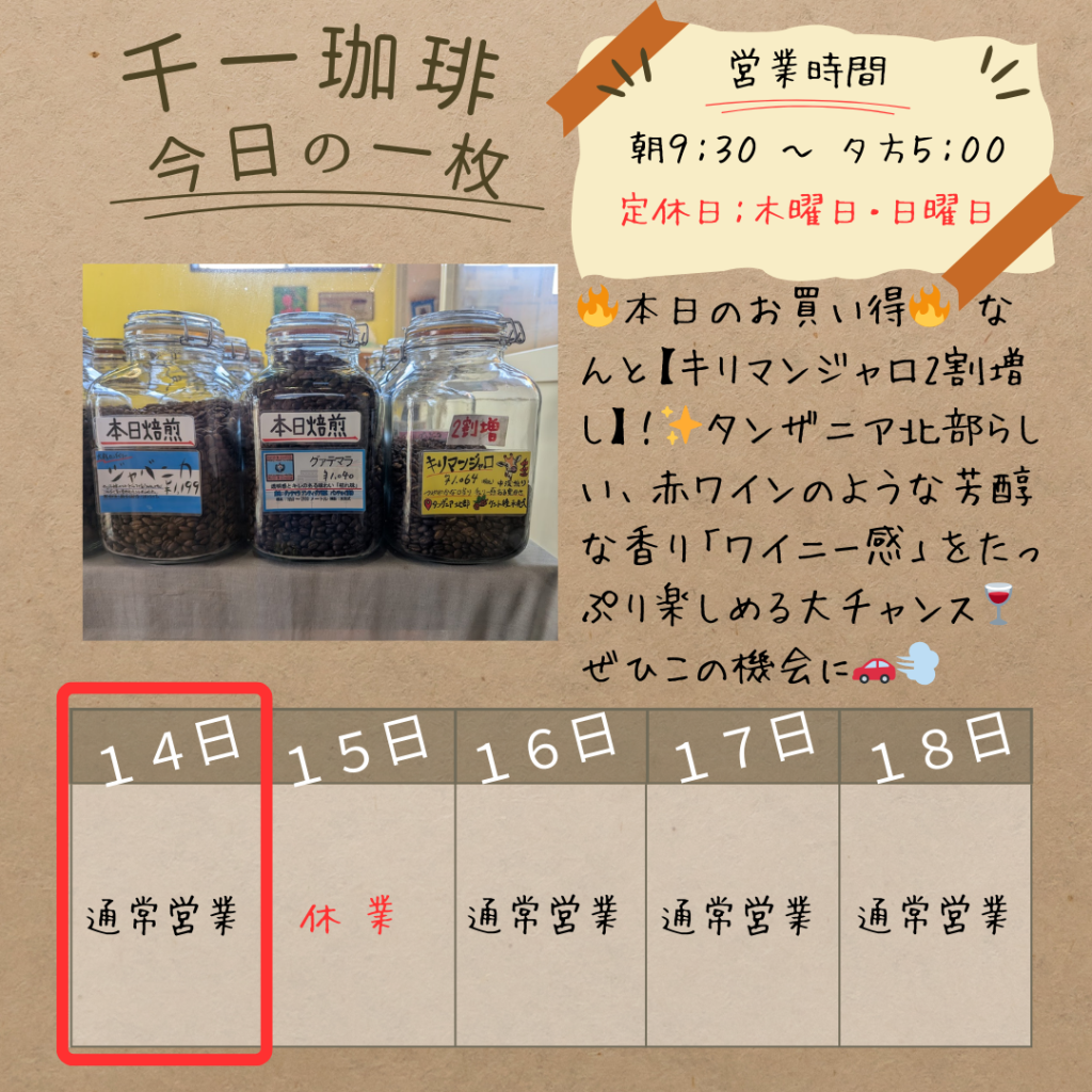 2026年3月14日 🔥本日のお買い得🔥 なんと【キリマンジャロ2割増し】です! 🔥本日のお買い得🔥 なんと【キリマンジャロ2割増し】です! さらに待望の「Newクロップ(新豆)」に切り替わりました🇹🇿✨タンザニア北部らしい、赤ワインのような芳醇な香り「ワイニー感」をたっぷり楽しめる大チャンス🍷ぜひこの機会にお試しください🚗💨 #千一珈琲 #鶴岡 #自家焙煎 #キリマンジャロ #コーヒー豆増量 岡部千信 千一珈琲の店主