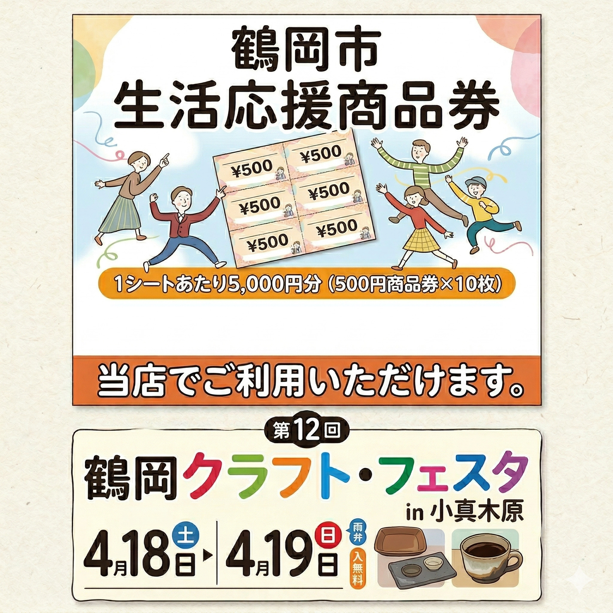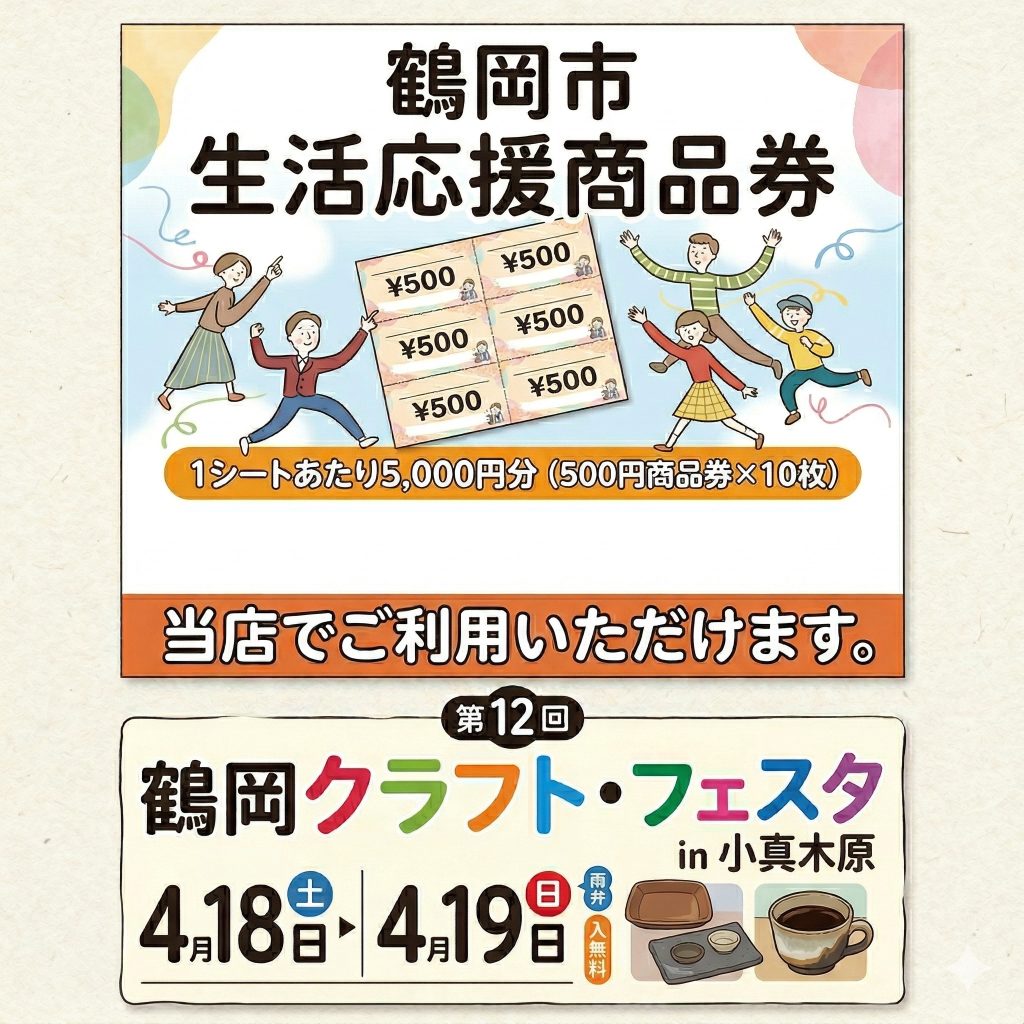 2026年4月6日 4月のビッグイベントのお知らせです📢 おはようございます!千一珈琲です☕️✨4月のビッグイベントのお知らせです📢 4/18(土)・19(日)の2日間『鶴岡クラフトフェスタ』に出店します🌸📍場所:鶴岡市小真木原公園 今年も美味しいホット&アイスコーヒー、自慢の自家焙煎豆をたっぷりご用意します😋☕️外で飲むコーヒーは格別ですよ〜! 詳細はイベント公式SNS(@tsuruoka_craftfesta)をチェックしてみてね👀本日も店舗は17:00まで営業中!お待ちしております🏠✨ 岡部千信 千一珈琲の店主