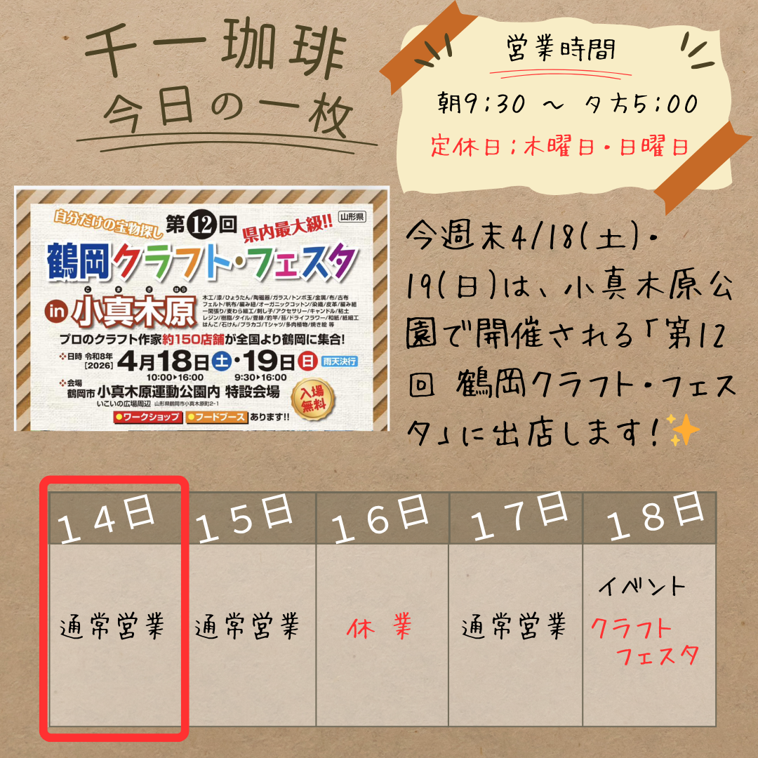 本日は皆様にワクワクするイベント出店のお知らせがあります。今週末の4月18日(土)・19日(日)の2日間、小真木原公園で開催される「第12回 鶴岡クラフト・フェスタ in 小真木原」に、千一珈琲も出店いたします!