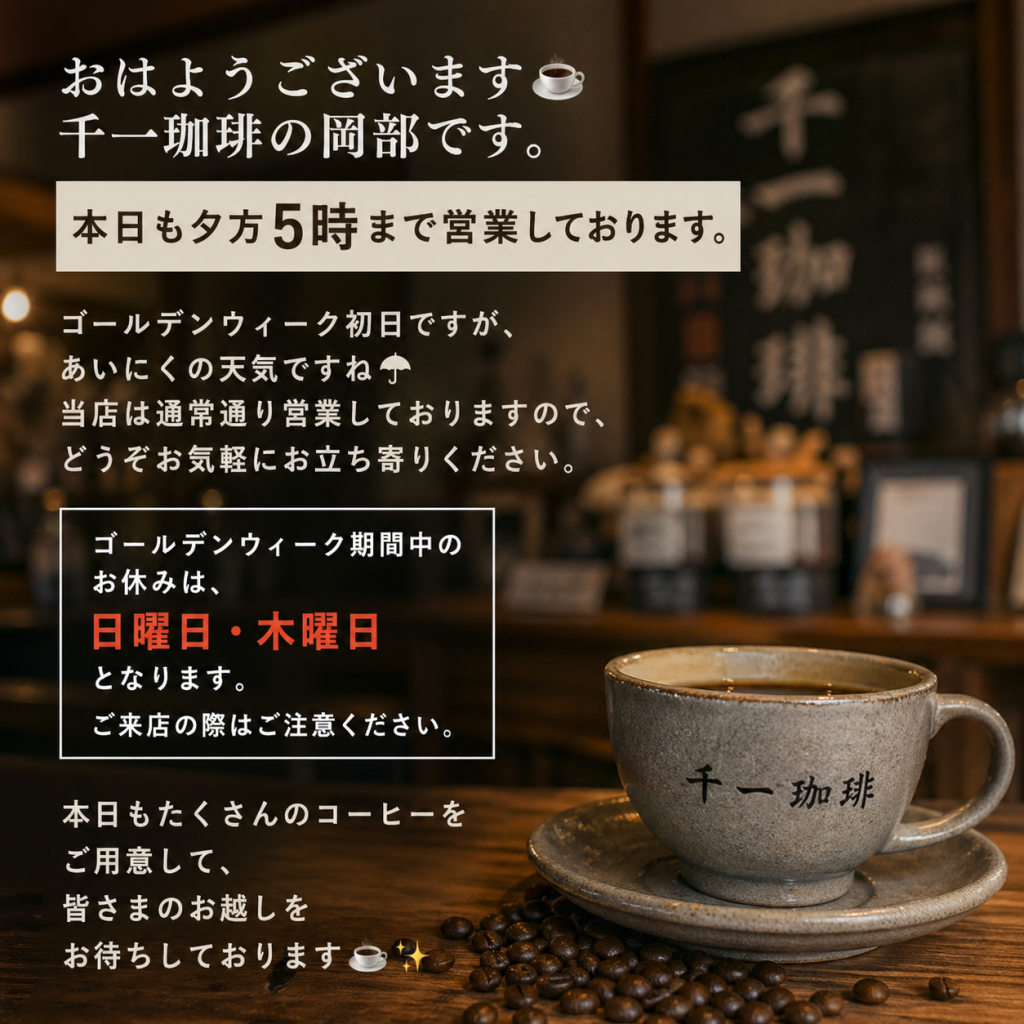 2026年4月29日 本日も夕方5時まで営業しております。 おはようございます☕千一珈琲の岡部です。 本日も夕方5時まで営業しております。 ゴールデンウィーク初日ですが、あいにくの天気ですね☔当店は通常通り営業しておりますので、どうぞお気軽にお立ち寄りください。 ゴールデンウィーク期間中のお休みは、日曜日・木曜日となります。ご来店の際はご注意ください。 本日もたくさんのコーヒーをご用意して、皆さまのお越しをお待ちしております☕✨ 岡部千信 千一珈琲の店主